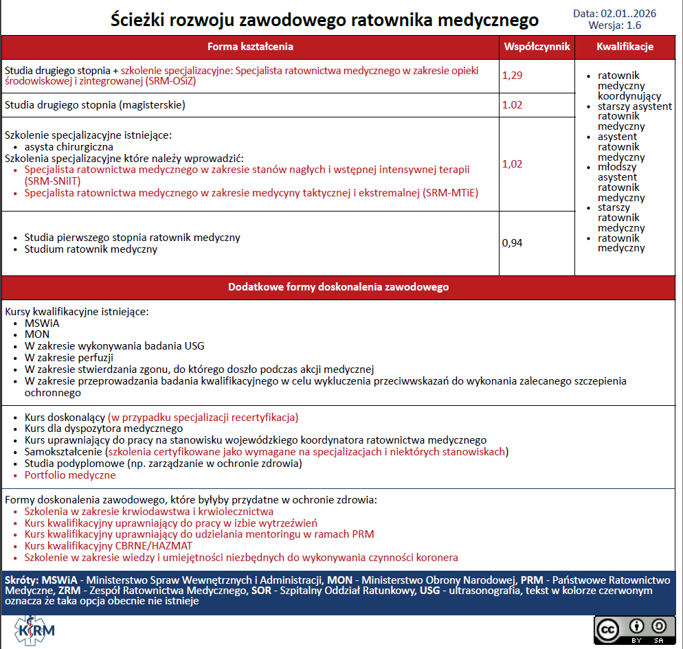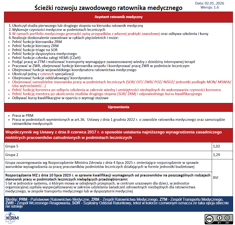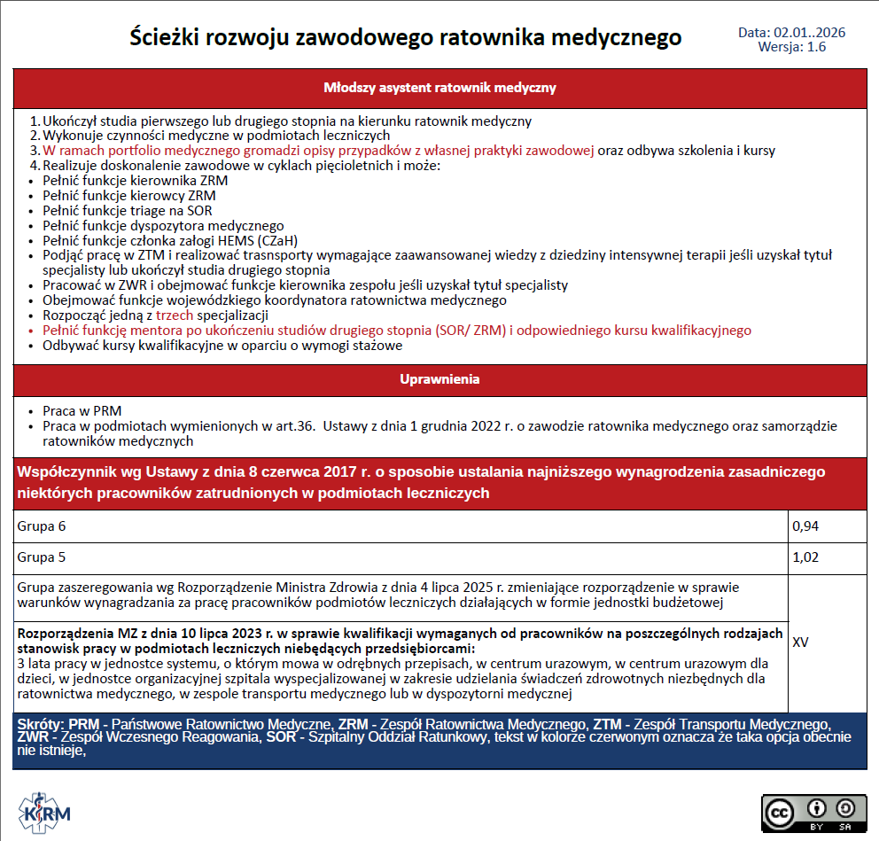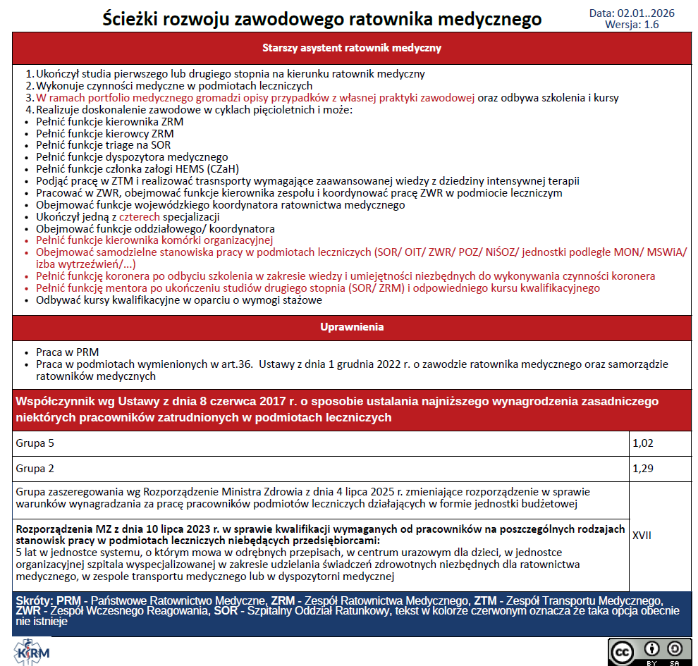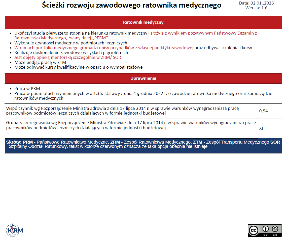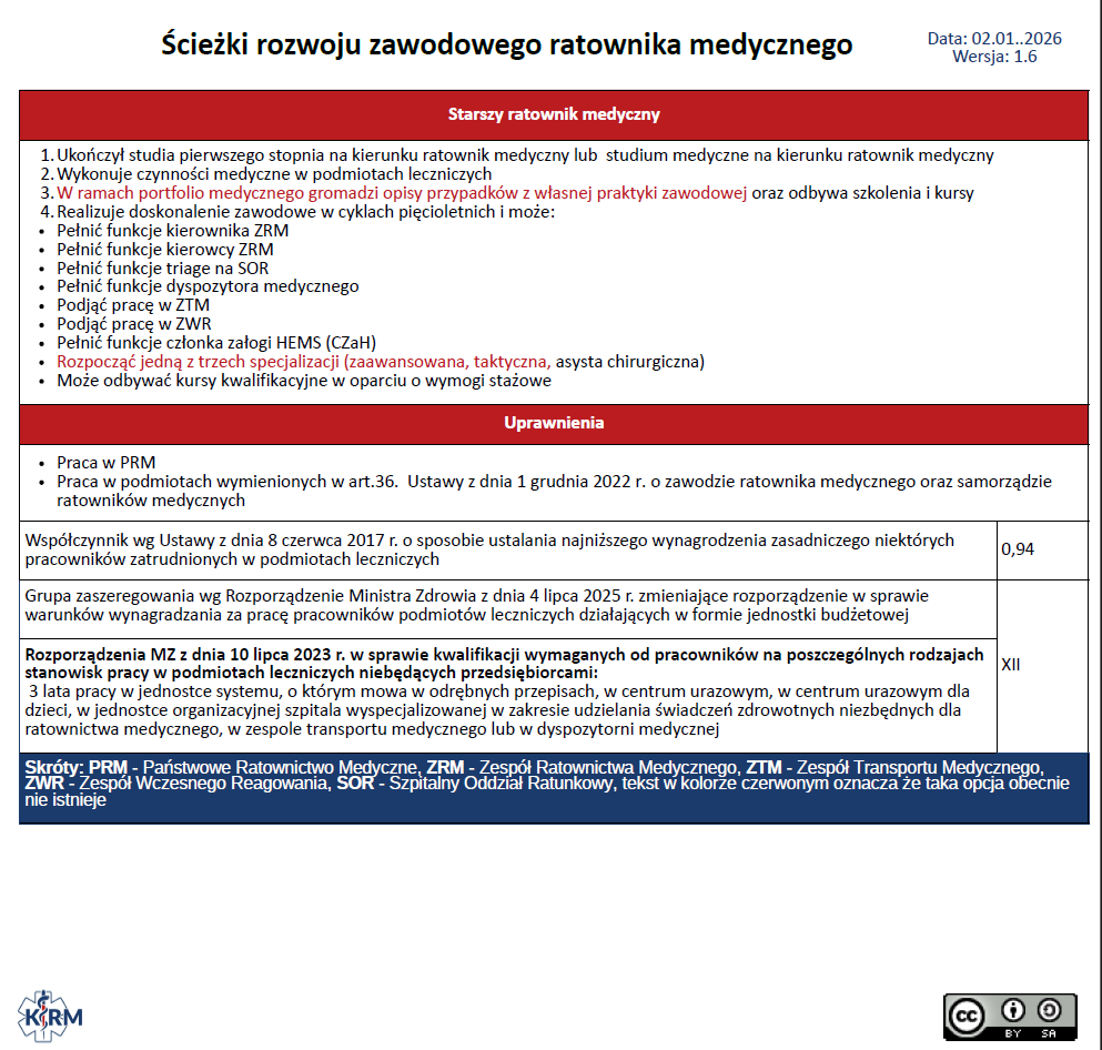 Wymagania odnoszą się do wykształcenia policealnego i studiów pierwszego stopnia, wykonywania czynności w podmiotach leczniczych, realizowania doskonalenia zawodowego w cyklach pięcioletnich, pełnienia funkcji kierownika lub kierowcy w zespołach ratownictwa medycznego, triażysty na oddziale ratunkowym, dyspozytorem medycznym, podjąć pracę w zespołach transportu medycznego, zespołach wczesnego reagowania, pełnić funkcję członka załogi HEMS w lotniczym zespole ratownictwa medycznego, odbywać szkolenia i kursy (tu znowu za Portfolio) oraz odbywać kursy kwalifikacyjne w oparciu o wymogi stażowe. Novum to Portfolio oraz możliwość rozpoczęcia szkolenia specjalizacyjnego.