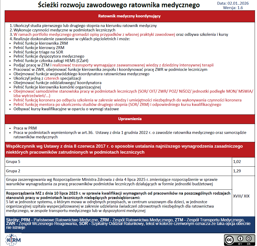 Podstawą stworzenia tej ścieżki, są kwalifikacje pracownicze wynikające z aktu wykonawczego przedstawiającego stanowiska pracy w podmiotach leczniczych niebędących przedsiębiorcami. W tym zakresie akurat poczyniliśmy jeden z naszych pierwszych artykułów, w którym powołujemy się na ten pseudo system gradacji, z którego dla wykonywania czynności zawodowych wynika tyle co nic. Poza tym, że to pracodawca może na podstawie regulaminu wynagradzania w podmiocie leczniczym dokonać rozróżnienia co do stażu pracy i ewentualnych kwalifikacji, wynikających ze zdobytego wykształcenia – co w chwili obecnej wobec ustawy regulującej wykonywanie zawodu Ratownika Medycznego, daje nadal tyle samo. Bo bez względu na rodzaj zdobytego wykształcenia (studium policealne, studia I stopnia, studia II stopnia) i staż pracy – wykonywanie zawodu odbywa się na tych samych warunkach z wykonywaniem tego samego zakresu medycznych czynności ratunkowych czy świadczeń zdrowotnych. Jedyne rozróżnienie co do zasady awansu – mamy tutaj stanowisko Koordynatora, który w myśl zapisu w rozporządzeniu – może kierować podległym mu pracownikom w komórce, której przewodniczy, a nawet być kierownikiem komórki organizacyjnej.